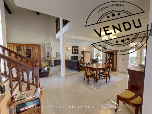 VENDU EXCLUSIVITE KEOPS ! Une superbe villa de construction traditionnelle située à Pérols, sur 2 niveaux d'environ 148m² habitables avec vue imprenable ! Les volumes sont spacieux, à commencer par le hall d'entrée qui dessert un bel espace salon-cuisine de 48m², le séjour cathédrale est climatisé et dispose d'un poêle à bois suspendu pour apprécier les soirées d'hiver. Vous profiterez également d'une cuisine de fabrication italienne, entièrement aménagée et équipée haut de gamme avec accés direct sur terrasse et d'une suite parentale lumineuse. A l'étage une mezzanine pourra être aménagée à souhait en bureau ou salle de jeux, 3 belles chambres ainsi qu'une salle de bains complète l'espace nuit. Fenêtres double vitrage, volets roulants électriques centralisés, alarme...Venez vous prélasser au bord de sa piscine, sans aucun vis-à-vis .... Le plus : un grand garage de 32m² isolé et carrelé disposant d'un espace buanderie. Maison très bien entretenue... Contactez-nous pour vos futurs projets !