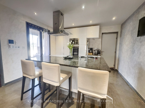 KEOPS IMMOBILIER : A Pérols, dans un environnement agréable, cette maison de 137 m² habitables, exposée plein sud, séduit dès les premiers instants par ses volumes généreux, sa luminosité et la qualité de ses prestations. Pensée pour une vie familiale confortable, elle offre un équilibre harmonieux entre espaces de vie conviviaux et extérieurs soignés. Dès l’entrée, vous découvrez un séjour traversant, une salle à manger conviviale et une cuisine indépendante. L’agencement fluide et fonctionnel facilite le quotidien et met en valeur les beaux volumes intérieurs. À l’étage, l’espace nuit se compose de quatre chambres de bonne taille, d’un bureau, d’une salle de bains avec WC et d’une salle d’eau rénovée, répondant parfaitement aux besoins d’une famille. La maison bénéficie d’annexes appréciables, avec une véranda de 17 m² exposée sud apportant une belle luminosité à la salle à manger, un garage, une place de stationnement intérieure, ainsi qu’une piscine 4 x 8 rénovée accompagnée d’une grande terrasse refaite récemment. Côté prestations, la façade est en bon état et la toiture a été contrôlée et isolée. Les menuiseries sont en double vitrage avec volets roulants électriques. L’électricité a été entièrement refaite et le cumulus est récent. Le confort est assuré par un poêle à bois récent et haut de gamme dans le salon, complété par des radiateurs électriques et une climatisation par split. À l’extérieur, la maison est équipée d’un portail électrique, d’une porte de garage motorisée, d’un forage et d’un système d’alarme. Une maison soignée et fonctionnelle, idéale pour accueillir une famille à la recherche d’espace et de confort. Les informations sur les risques auxquels ce bien est exposé sont disponibles sur le site Géorisques : www.georisques.gouv.fr