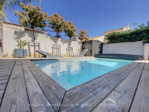 EXCLUSIVITE KEOPS IMMOBILIER PEROLS : Située à l’ouest de Pérols, dans un environnement résidentiel calme, cette maison 4 faces de construction traditionnelle offre 139 m² habitables sur deux niveaux, avec des volumes généreux et un excellent état général. Au rez-de-chaussée, vous découvrirez une belle entrée desservant un vaste salon-séjour lumineux avec sa cuisine ouverte entièrement aménagée et équipée, d’environ 56 m². Une chambre, un bureau, une salle de bains, un cellier et des WC indépendants complètent ce niveau. À l’étage, trois chambres supplémentaires ainsi qu’une salle d’eau avec WC offrent un espace nuit confortable pour toute la famille. Côté prestations, la maison a bénéficié de nombreux travaux récents : isolation, sols et peintures. Les menuiseries sont en PVC double vitrage avec volets roulants électriques. Climatisation, cuisine et pièces d’eau modernes : l’ensemble a été soigneusement entretenu pour un confort optimal. À l’extérieur, vous profiterez d’un jardin, d’une terrasse sur plots, d’un bassin de 10m², et d’un garage de 17 m² avec porte motorisée. Un portail électrique et une place de stationnement privative sur la parcelle complètent les atouts de ce bien. Une maison prête à vivre, située dans un quartier paisible, à proximité des commodités et axes principaux. Aucun travaux à prévoir. Les informations sur les risques auxquels ce bien est exposé sont disponibles sur le site Géorisques : www.georisques.gouv.fr
