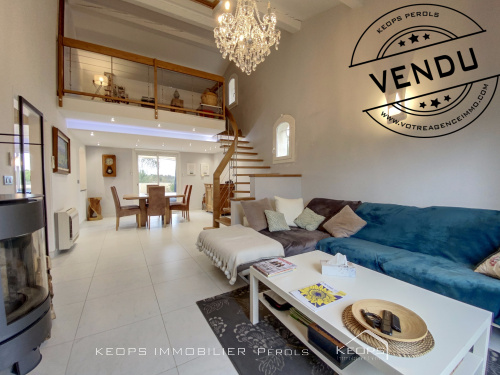 VENDU ! En exclusivité, superbe villa de plain pied de 111m² située à Pérols, offrant des prestations de qualité et un confort optimal. Parfaitement entretenue et prête à vous accueillir, cette maison se compose d'une belle entrée avec un grand placard, d'une vaste pièce à vivre lumineuse avec plafond cathedrale, et d'une cuisine séparée, entièrement aménagée et équipée récemment. Le coin nuit comprend deux chambres avec placards, reliées par une salle d'eau entièrement rénovée, une suite parentale avec salle d'eau privative. La villa dispose d'un double garage de 30m² et bénéficie d'une orientation Sud-Ouest. Une grande terrasse, accessible depuis la cuisine et la pièce de vie, vous permettra de profiter pleinement de l'extérieur, piscinable et parfaitement entretenu, reflétant l'image soignée de la maison. De plus, la maison est sécurisée pour votre tranquillité d'esprit et équipée de nombreuses prestations : climatisation, double vitrage, volets roulants électriques, arrosage automatique, forage Vous aussi vous avez un projet de vente ? Contactez-nous !